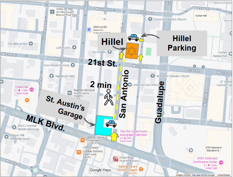 About 10 parking spaces are available in Hillel’s parking lot (AirGarage Public Parking), located behind the Hillel building between San Antonio and Guadalupe streets.