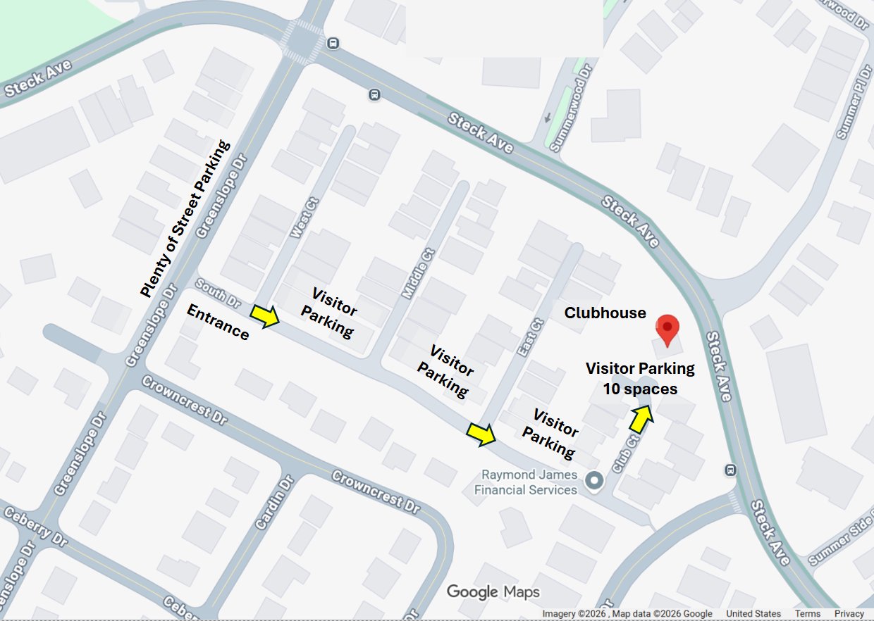 Villa Serena Clubhouse is located at 8111 Club Ct, Austin, TX 78759, near Steck and Greenslope. (Use the Steck Exit from Mopac.)